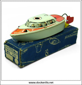 Police Boat MS 709. Vintage Clockwork Tin Plate Toy, Michael Seidel, West Germany.