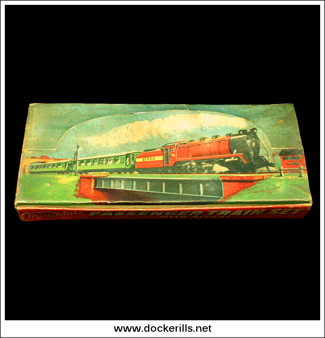 Original vintage tin plate penny toy train set. All tin plate. Includes G.T.P. 511 locomotive, 512 tender, 513 coach, 314 dining car as well as an unmarked signal. Manufactured in Porth, South Wales by Glamtoy / Glamorgan Toy Products (see my blog for more details on this company). Originally distributed through Woolworths. Dates to pre 1953 when the company was wound up. A very rare set in its box.