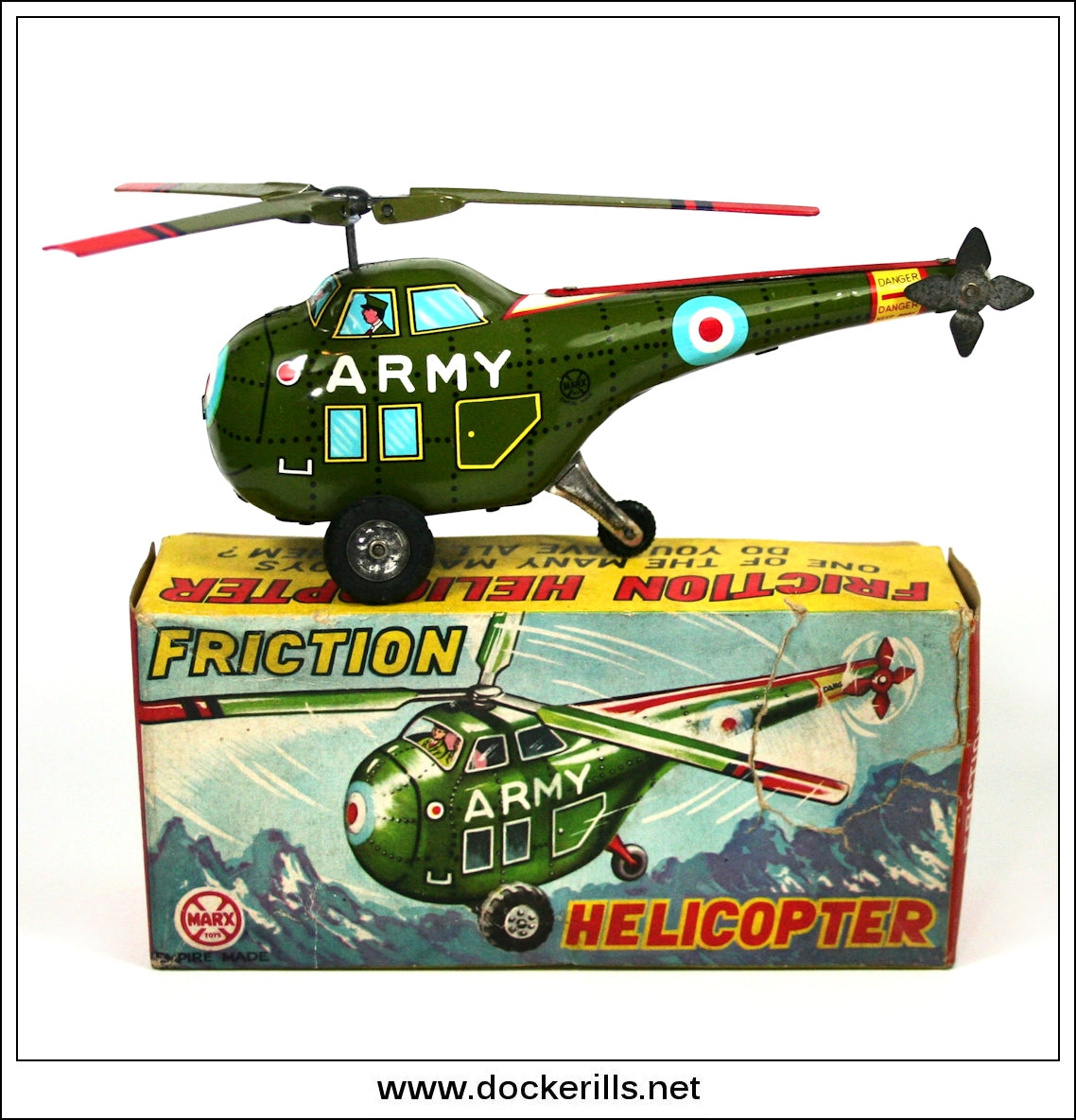 Original tin plate 'Helicopter' produced for Marx, Great Britain (in Hong Kong) for the British market. Marked with the older British version of the Marx trade mark and 'Empire Made'. Pre 1970. In original colourful box.