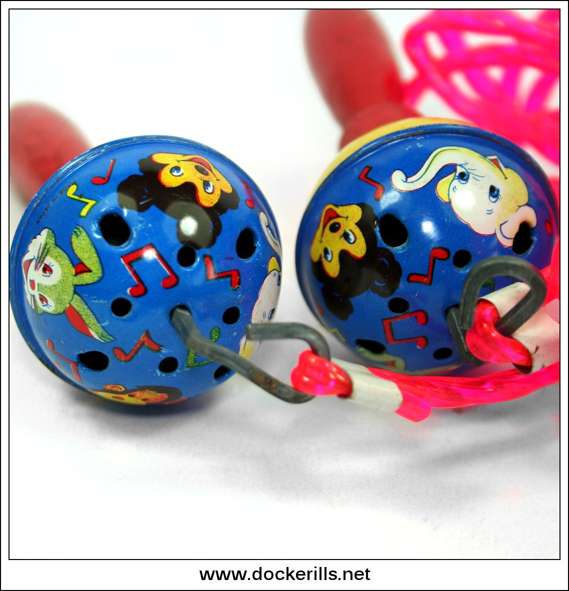 Tin plate musical skipping rope featuring Mickey Mouse and various other cartoon characters. Marked 'Made in Japan' only. No trade mark but it does appear in Daishin catalogues. Tin plate mechanism with wooden handles and fluorescent pink plastic rope.