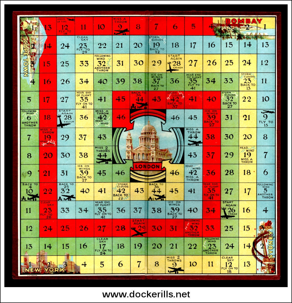 Vintage Fairylite board game. Made in England. Consists of colourful board and separate box containing period prop plane shaped counters, shaker, dice. The game instructions are printed inside the lid of the counter box. Dates to c. 1950.
