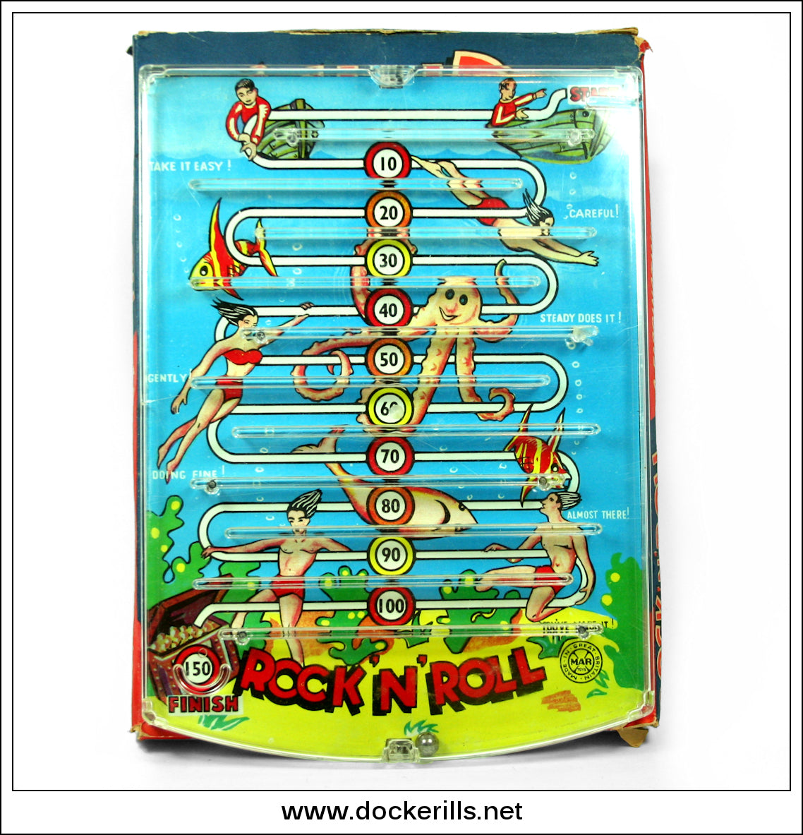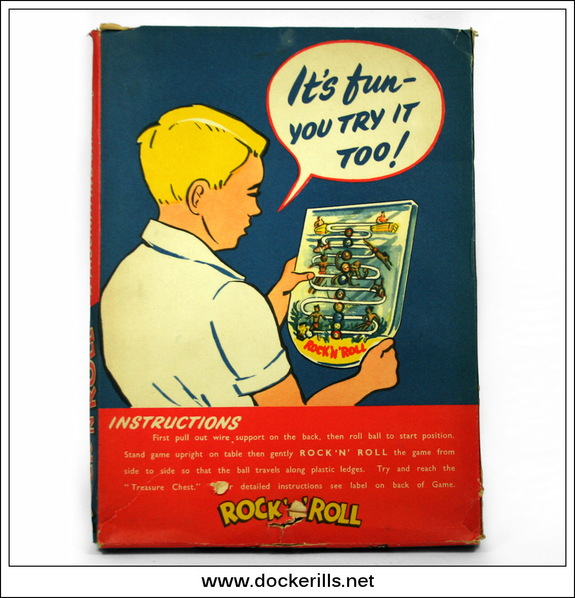 Original 1960's "Rock 'N' Roll Game" produced by Marx, Great Britain. Colourful printed tin plate back with clear plastic front. This looks like one of the Marx Bagatelle games but is, in fact, more like a dexterity game. Instructions for play are printed on the back of the game and also on the box. Rare item, particularly with original box.