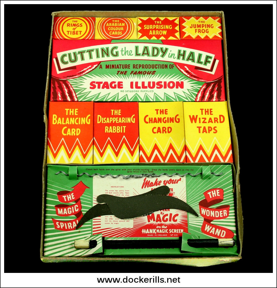 Original vintage conjurers outfit. Colourful box of tricks intended for children. Marked "Made in England" but with no maker attribution or trade mark.