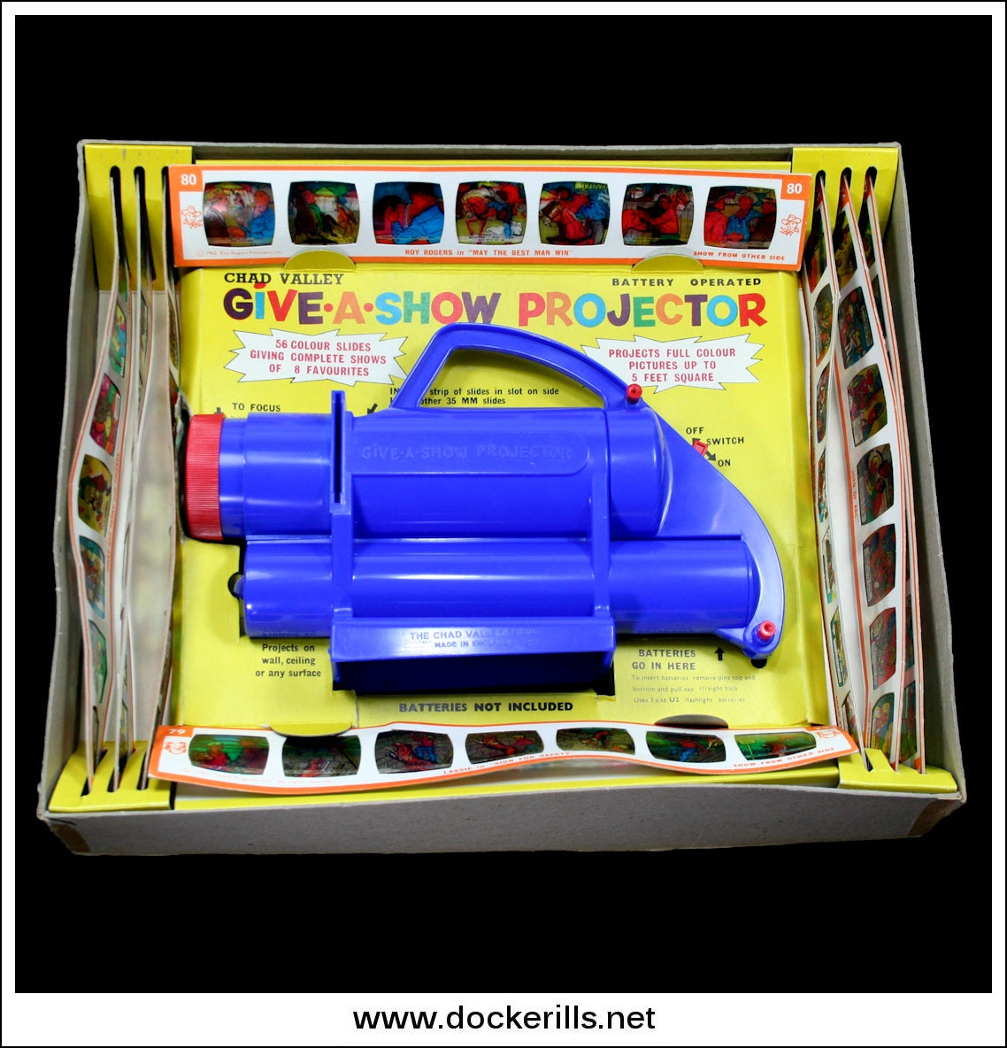 Original vintage 'Give-A-Show' projector. Manufactured by Chad Valley. Marked "Made in England". This is a battery operated projector which can be used to project strips of slides onto walls etc. Eight slide strips are included based on various childrens TV programs etc. of the period (c. early 1960's). The Roy Rodgers copyright marked on the box is for 1962.