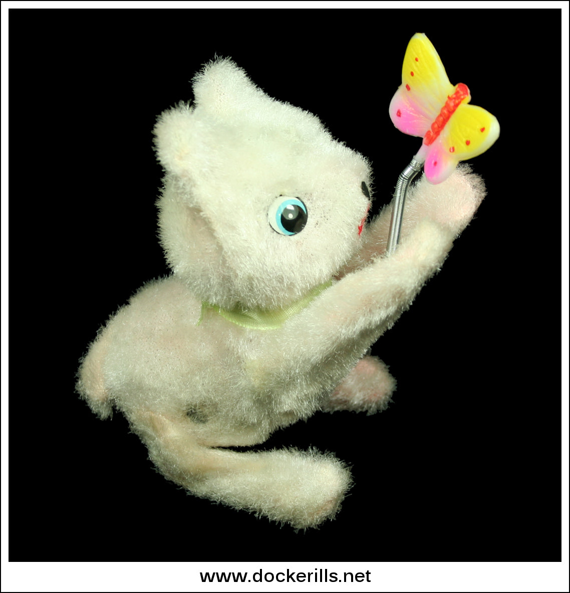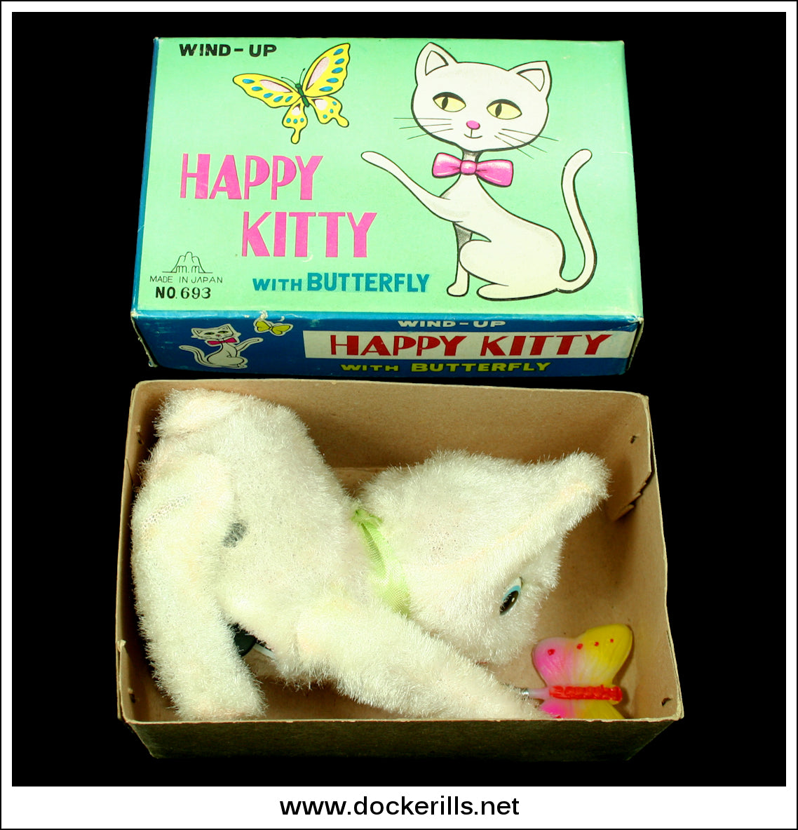 Original vintage plush covered "Happy Kitty With Butterfly" novelty toy from the 1960's. The toy is not marked but the box is with the Fuji Press trade mark (M.N. within a mountain motif) and also "Made in Japan". In original box. Manufacturers No. 693.