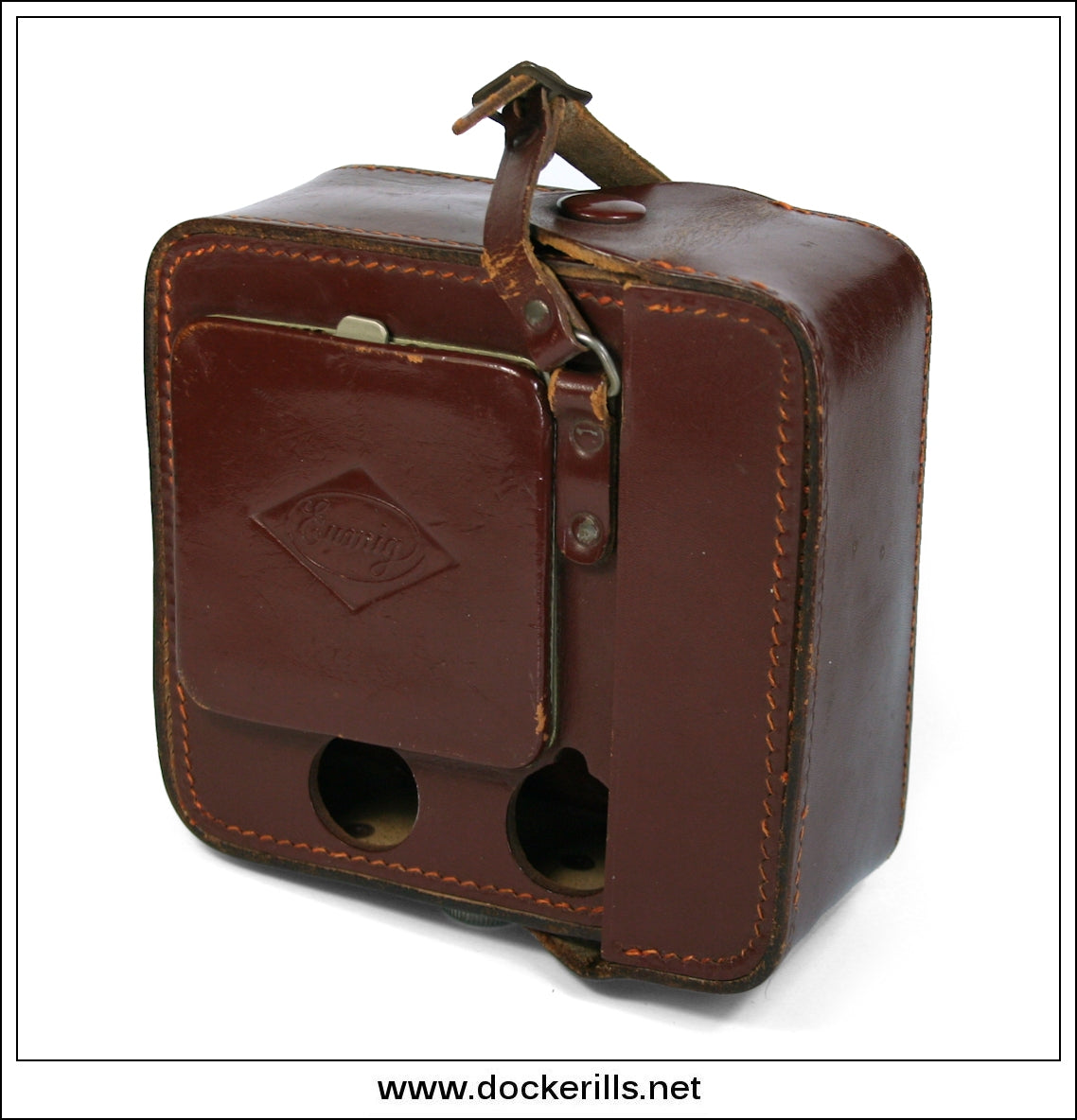 Vintage, c. 1950's, clockwork / wind-up cine camera. Metal construction with Leather case. Made in Austria. Produced between 1937 and 1959. The flap on the side of the case hinges down to reveal the winder mechanism.