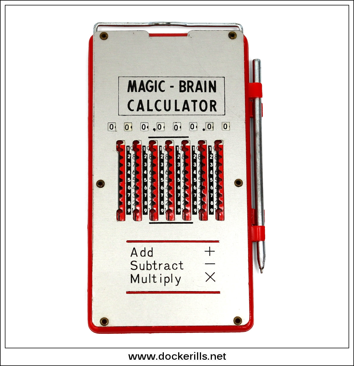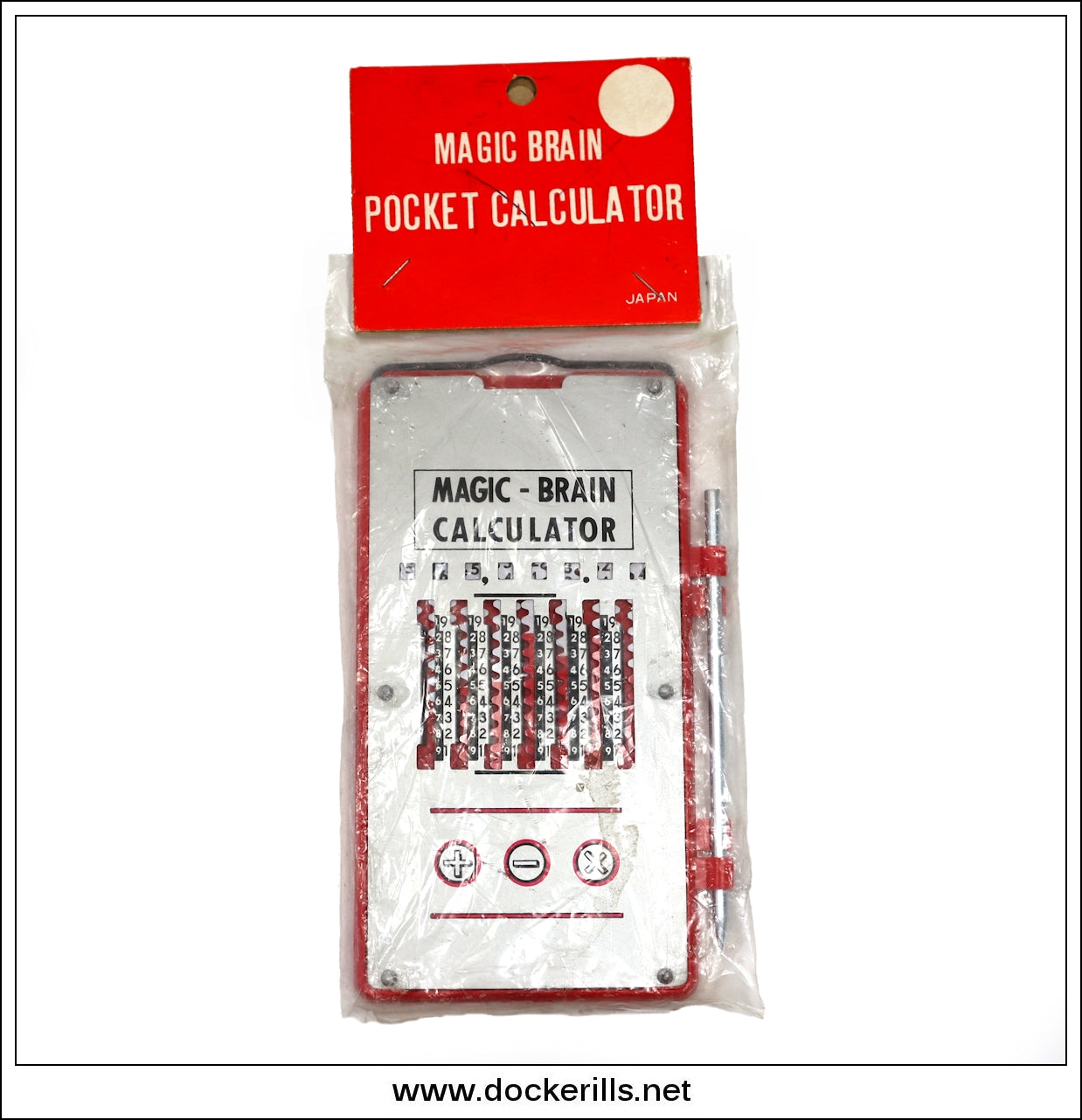 Vintage mechanical calculator in original packaging with instructions. Maufactured in Japan. No maker marked on calculator or packaging. Probably produced over a period of time though certainly available in the 1960's and 1970's. Red version. Supplied, new in original packaging (see second photo). The photograph of an unwrapped example shown for illustration purposes only.